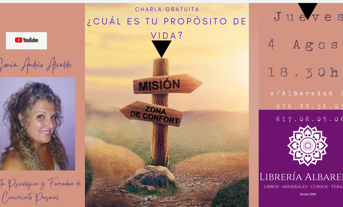 Hola Olga…. Encantada. He visto que te has apuntado a la charla de mi propósito de vida. Genial. Normalmebte las hago en varios locales pero al ser Agosto como cierran esta vez será, uni camente aquí. No obstante si quieres mas información gratuita de valor o ver de q han ido otras charlas o cursos tienes micanal de youtube: Sonia Andrío Alcalde. Bueno feliz día y su todo va a favor nos vemos el jueves 4 de Agosto.