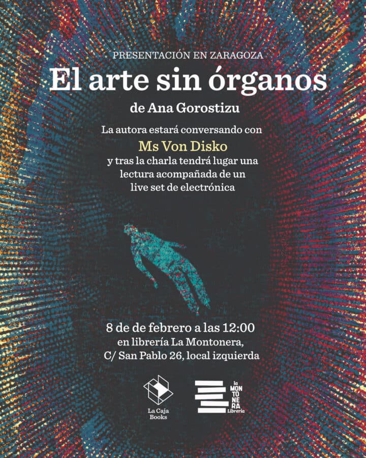 El sábado 8 de febrero a las 12:00 horas, Ana Gorostizu presentará «El arte sin órganos», acompañada por la DJ Ms Von Disco. Gorostizu, licenciada en Filosofía y con un Máster en Historia del Arte Contemporáneo y Cultura Visual, explora en su ensayo la intersección entre la música electrónica y la experiencia humana. A través de etnografías de raves y análisis teóricos, la autora analiza cómo la música electrónica actúa como interfaz entre la humanidad y la tecnología, proponiendo una mística del techno y una reflexión sobre la fiesta como espacio de libertad y diversidad. Al final de la presentación la autora ofrecerá también una performance musical.