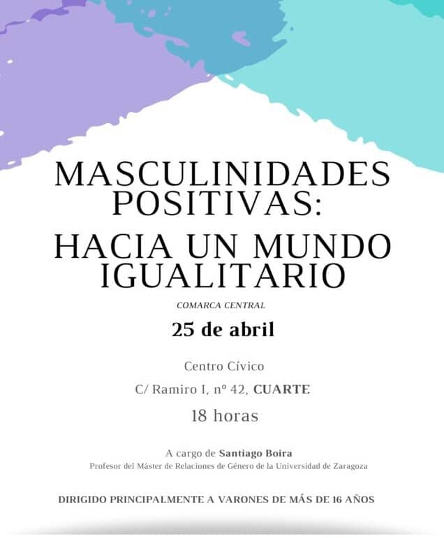 El profesor de la Universidad de Zaragoza y Presidente del Colegio Profesional de Psicólogos de Aragón, Santiago Boira, nos ofrecerá una charla prioritariamente dirigida a hombres mayores de 16 años, en la que se abordará el impacto que los estereotipos de género tienen sobre ellos, planteando en último término una reflexión sobre el papel que la sociedad adjudica a los hombres y el papel que quieren desempeñar ellos.