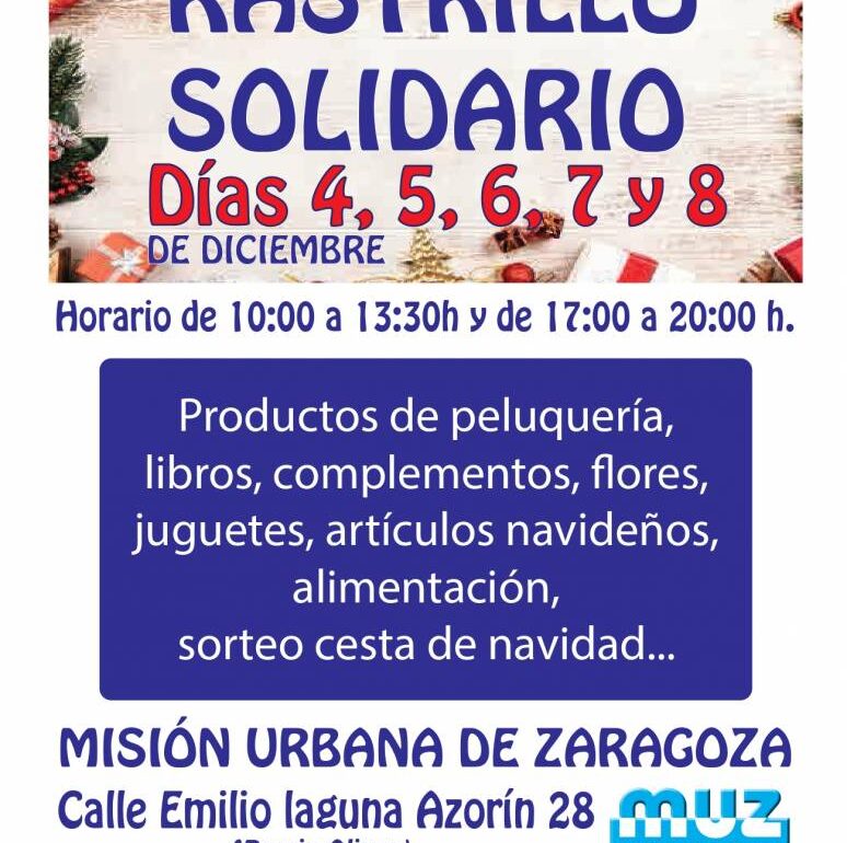 Celebración de rastrillo para recaudar fondos para la realización de actividades con familias en riesgo de exclusión social en Zaragoza. Venta de productos nuevos y de segunda mano: productos de peluquería, libros, complementos, flores, juguetes, artículos navideños… y sorteo de cesta de navidad.